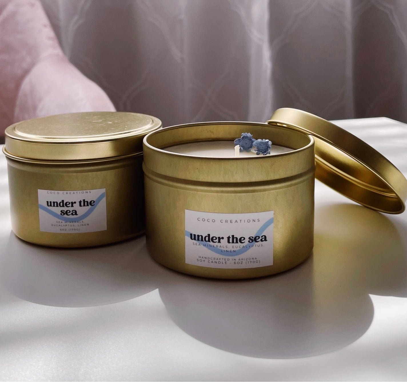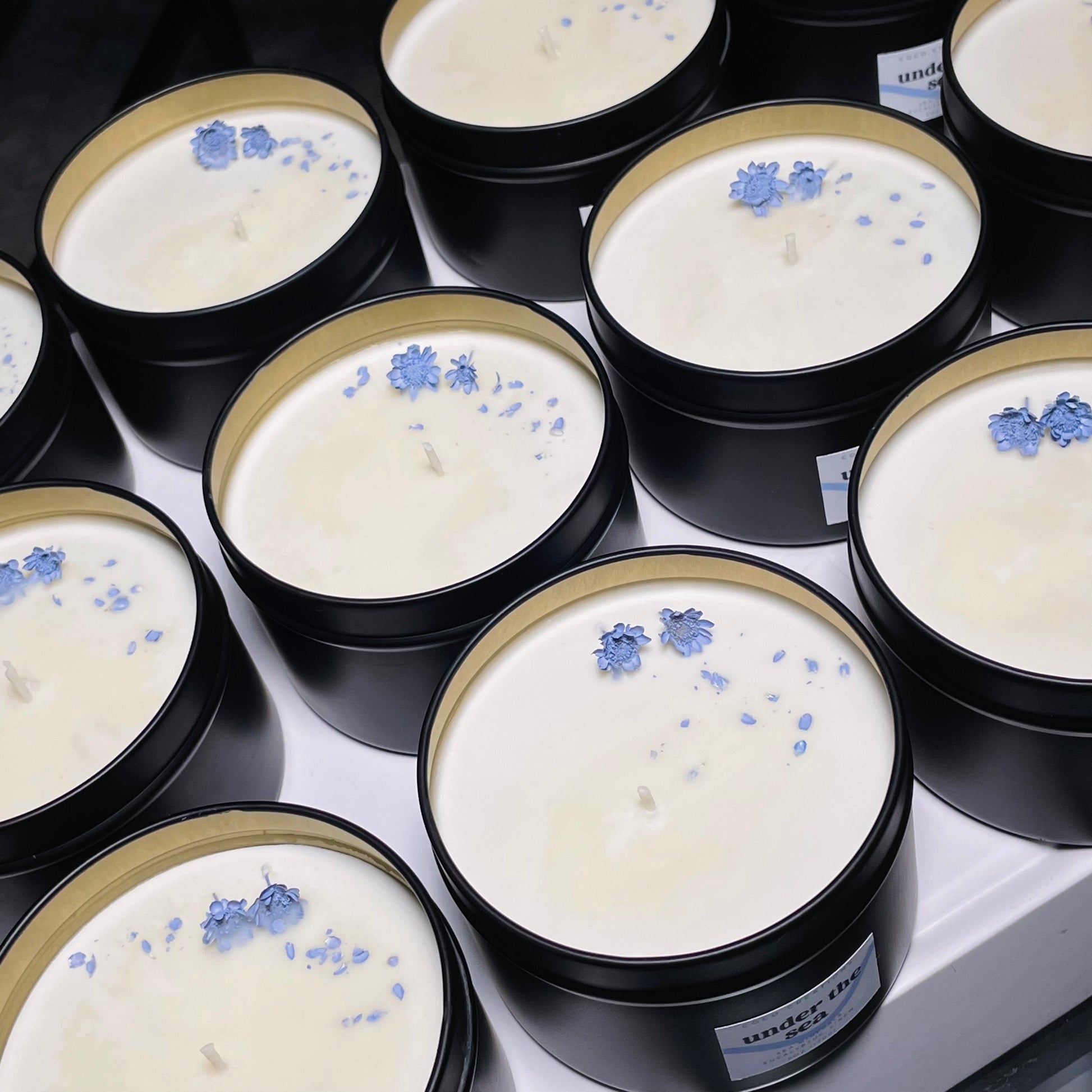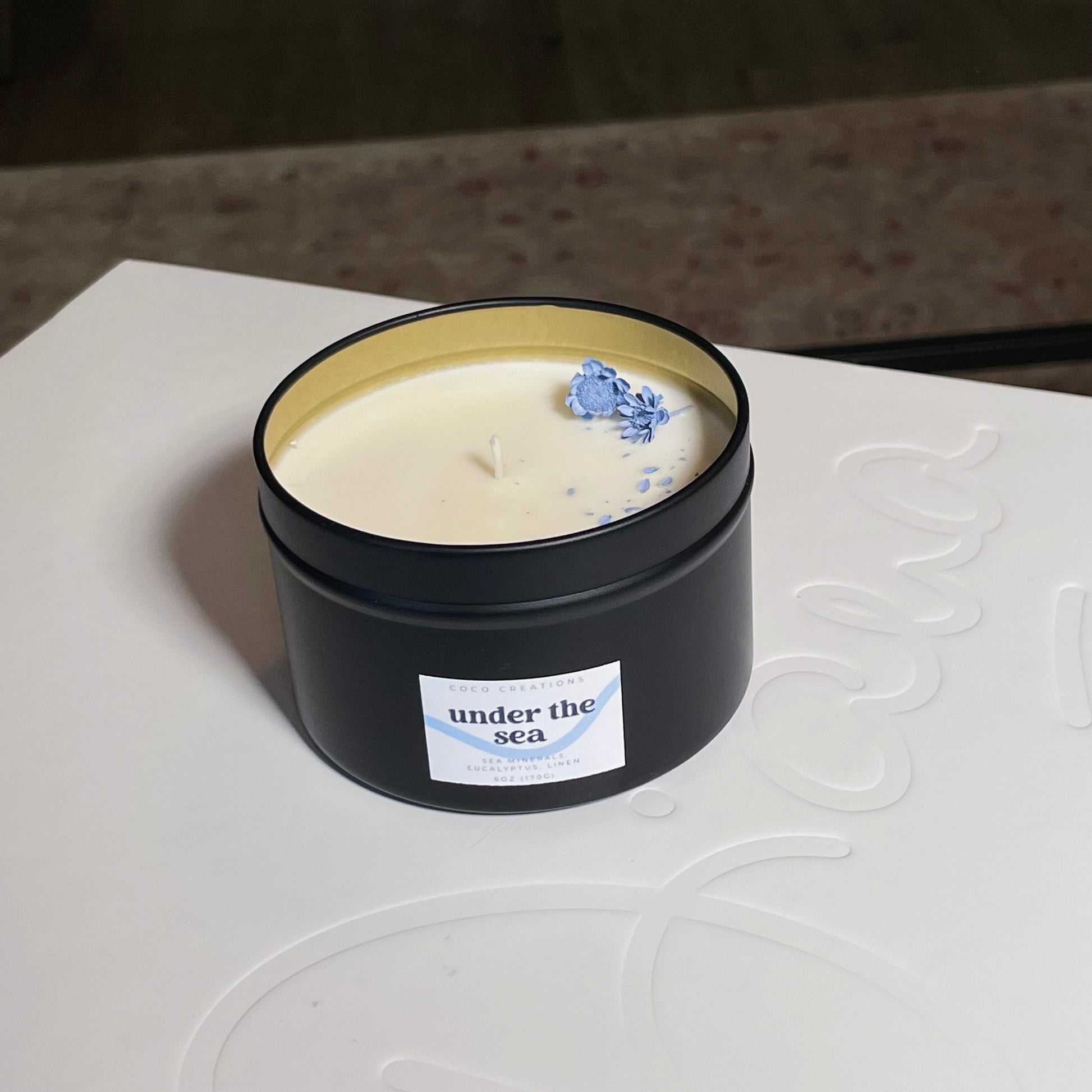 Key Notes: Sea salt, eucalyptus, linen, ozone, freesia, moss, and powder. Infused with essential oils patchouli, eucalyptus, pine, and citronella. Topped with blue starflowers.